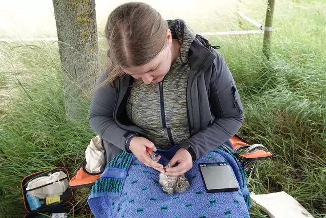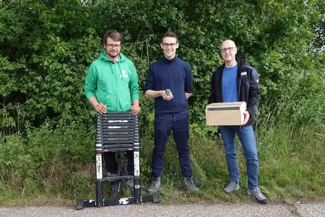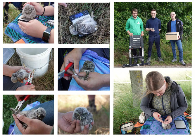 Nur mit dem Vertrauen der Eigentümer*innen konnten wir die Kästen an geeigneten Orten montieren. Das bedeutet, dass der Schutz und die Diskretion der Standorte oberste Priorität haben. Die Nistkästen haben feste Betreuer*innen, die sie jährlich im Herbst reinigen und im Frühjahr kontrollieren. Wird eine Brut festgestellt, werden die Jungkäuze und, falls im Nistkasten anzutreffen, auch die Alttiere im Rahmen des Beringungsprojekts "Brutpopulationsuntersuchung am Steinkauz" des Max-Planck-Instituts für Verhaltensbiologie (Vogelwarte Radolfzell) von Elisabeth Hatzenberger und Michael Ziara beringt. Dies ist ein wichtiger Baustein unseres Projekts. Dabei erhalten die Steinkäuze mit Genehmigung des Regierungspräsidiums einen Metallring mit einer individuellen Nummer der Vogelwarte Radolfzell – quasi ihren „Personalausweis“.