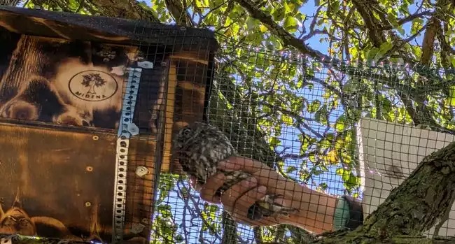 Anders verhält es sich beim Soft Release, das wir 2024 erstmals erprobt haben. Diese Methode kommt zum Einsatz, wenn die Jungkäuze aus dem Zoo schon flügge sind und damit nicht mehr supplementiert werden können. Sie werden dann für drei Tage in kleine, an die Nisthilfen montierte Volieren gesetzt und dort mit Futter versorgt. Nach drei Tagen öffnet man die Volieren und die Jungkäuze fliegen frei. Der entscheidende Vorteil ist, dass sie die Nisthilfe bereits als sicheren Tageseinstandsplatz kennen und sie häufig weiter nutzen. Dadurch wird die Wahrscheinlichkeit erhöht, dass die ausgewilderten Tiere vor Ort bleiben und nicht weiter verstreichen. Auf diese Weise können gezielt Lücken im Projektgebiet geschlossen werden. Bei der diesjährigen Brutkontrolle haben wir an einer Stelle, an der es bislang keine Steinkauznachweise gab und wir daher 2024 mit dieser Methode ein Individuum ausgewildert hatten, eine gescheiterte Brut festgestellt. Das adulte Weibchen konnten wir greifen - es war unberingt. Der ausgewilderte Vogel diente somit wohl als "Ankervogel", der eine Partnerin angelockt hat.
